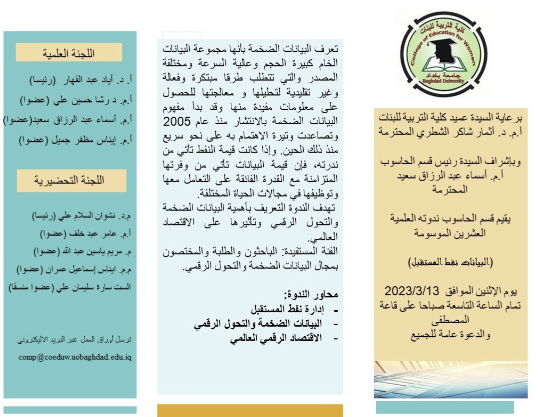 Department of Computer Sciences held a symposium about (Data is the Oil of the Future), at Al-Mustafa Hall, on March 13, 2023. Data can be very valuable to obtain insightful information when gathered accurately and connected with other relevant data. The term “Data Economy” refers to the impact of big data in world’s economy. The symposium addressed machine learning and using algorithm to extract patterns from a large data set.
