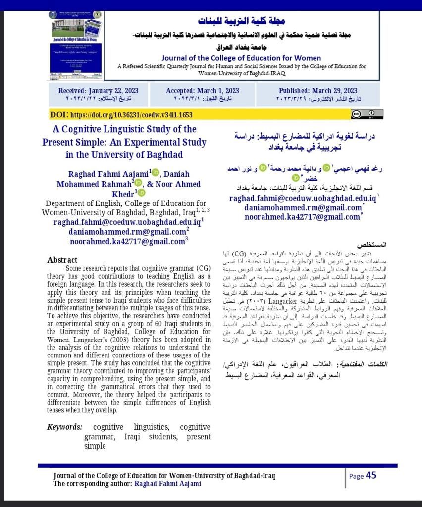 Under the supervision of Lect. Raghad Fahmi, the undergraduate students Daniah Mohammed and Noor Ahmed published a research paper titled “A Cognitive Linguistic Study of the Present Simple: An Experimental Study in the University of Baghdad”. The research paper is published in Journal of the College of Education for Women, the issue of March29, 2023[Vol. 34(1)].