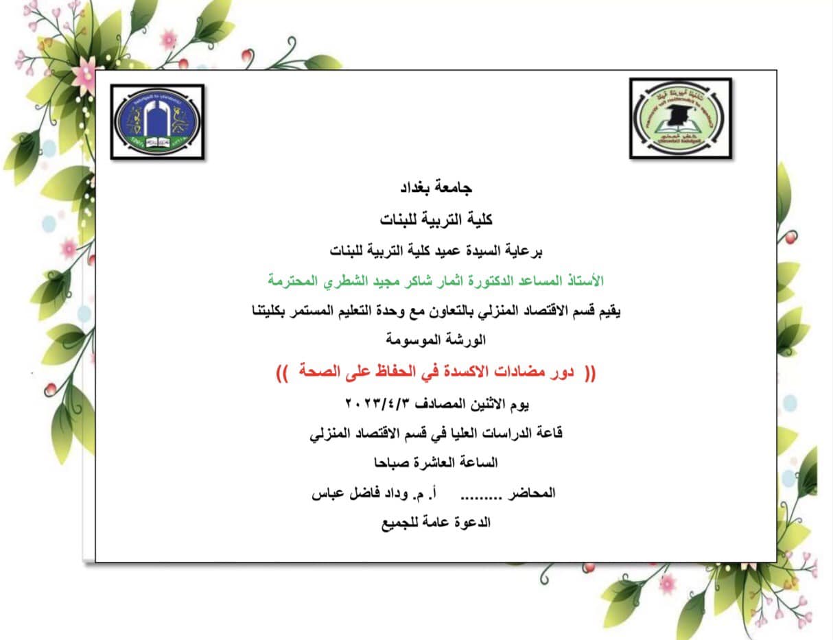 Department of Home Economics and Lifelong Learning Unit organized a joint workshop on the role of antioxidants in health maintenance, at the Department of Home Economics, on April 3, 2023. The speakers elaborated on the importance of antioxidants in health maintenance, the types of antioxidants, antioxidants mechanism, and the foods high in antioxidants.