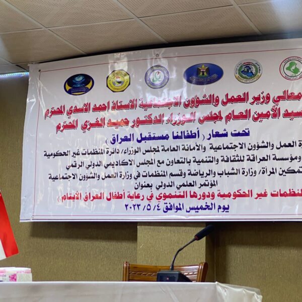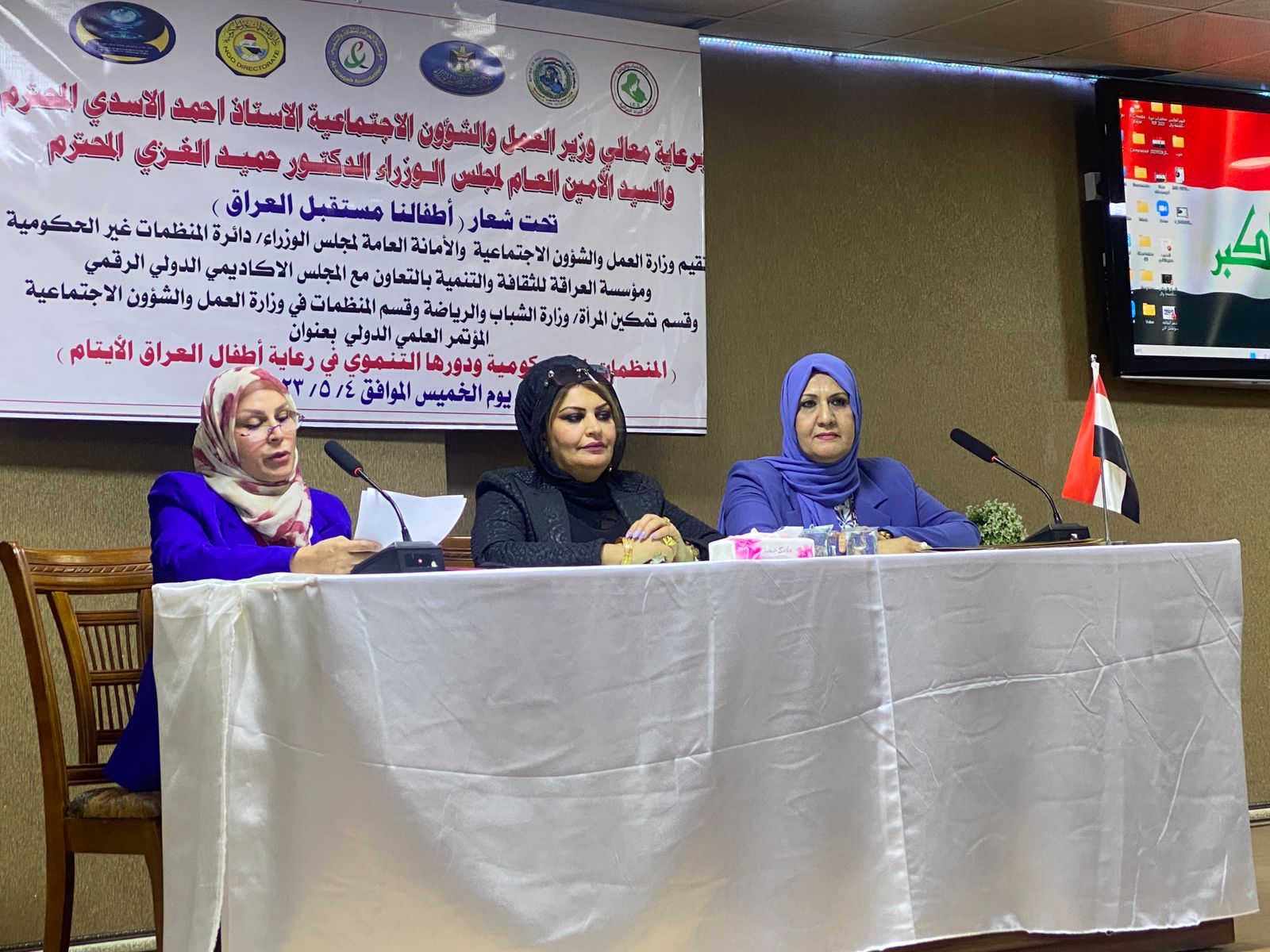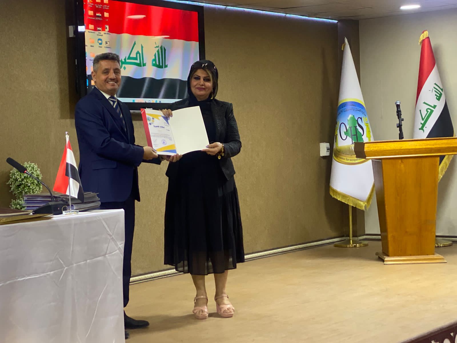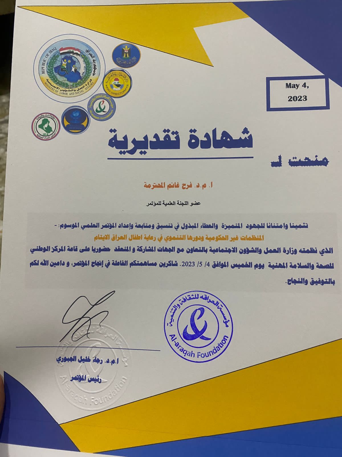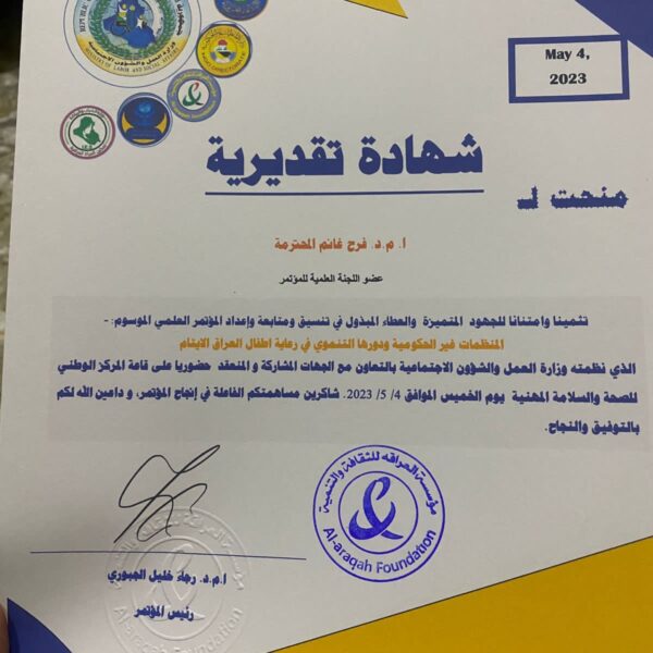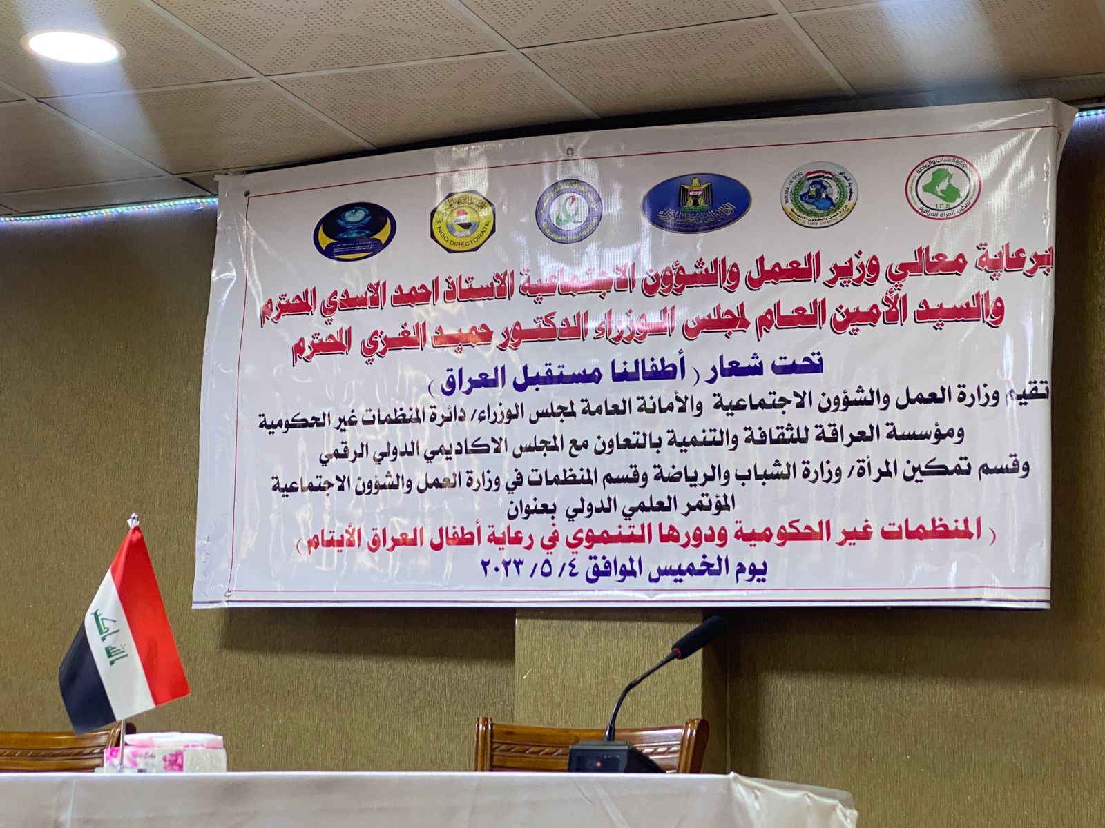 Asst. Prof. Dr. Farah Ghanim Salih in department of Arabic in College of Education for Women, participated in events of the international scientific conference which held by The Ministry of Labor and Social Affairs in cooperation with the General Secretariat of the Council of Ministers on Thursday, May,4.2023 under title “Our children are the future of Iraq”. Dr. Salih moderated the research session by information on the reality of childhood in Iraqi society at the current stage.