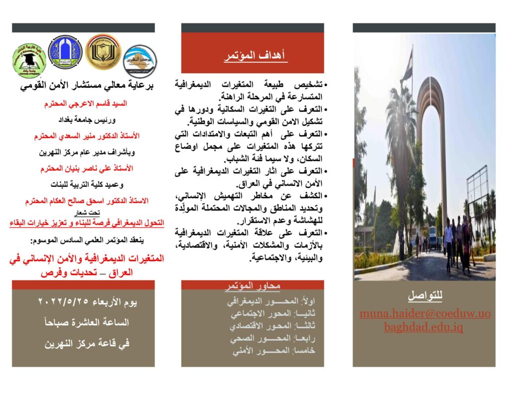 The sixth annual conference of the Department of Sociology on “Demographic Variables and Human Security in Iraq: Challenges and Opportunities”, took place at Al-Nahrain conference hall on 25 May 2022. The conference was organized in partnership with Al-Nahrain Center for Strategic Studies. Most recent studies have addressed the demographic pressure in Iraq after liberating its provinces from the Islamic State. Population projections are unreliable in our country since the last census was conducted in 1987, and it did not include The Kurdistan Region. The primary objectives of the conference are to address the high fertility rates, unprecedentedly rapid population growth, youth unemployment, and to create a policy for sustainable development.