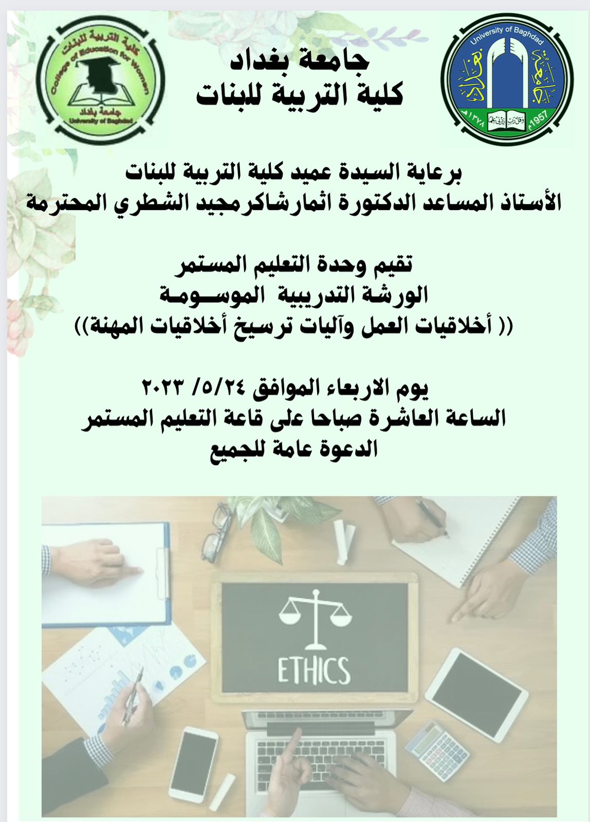 Supervised by the Dean of the College of Education for Women, Prof. Dr. Athmar Shaker Majeed Al-Shatri, The lifelong learning unit held a training workshop about “work ethics and mechanisms for consolidating the profession” on Wednesday, May, 24.2023 in the lifelong learning hall. The workshop highlighted on how Recognizing morals and their importance in the monotheistic religions and the Islamic religion, which came to urge everyone to honor the morals of the workshop.