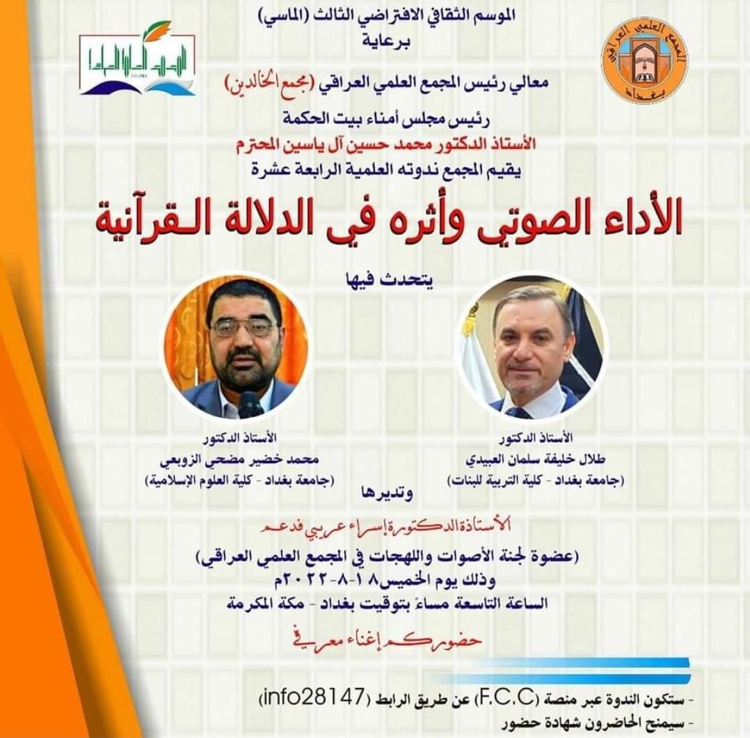 Prof. Dr. Talal Khalifa Salman, Professor at the Department of Arabic Language, was invited to give a lecture at Iraqi Academy of Sciences, on August 18, 9 pm. The topic of the lecture was “Vocal Performance and its Impact on Qur’anic Connotative Meaning”.