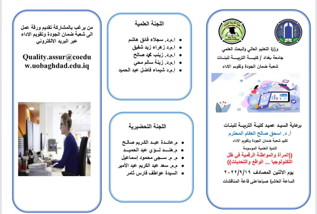 Quality Assurance and Performance Appraisal Section held a Symposium on (Women, Digital Citizenship, and the Use of Technology: Virtual Reality and Challenges). The Symposium was held in the Viva Voce Hall, on Monday, September 19, 2022. The speakers’ research papers discussed the definition of digital citizenship, how women can stay safe online, the benefits and skills of digital citizenship, and raising children in a digital world. The participants also addressed digital education, digital trade, digital security, and digital etiquette.