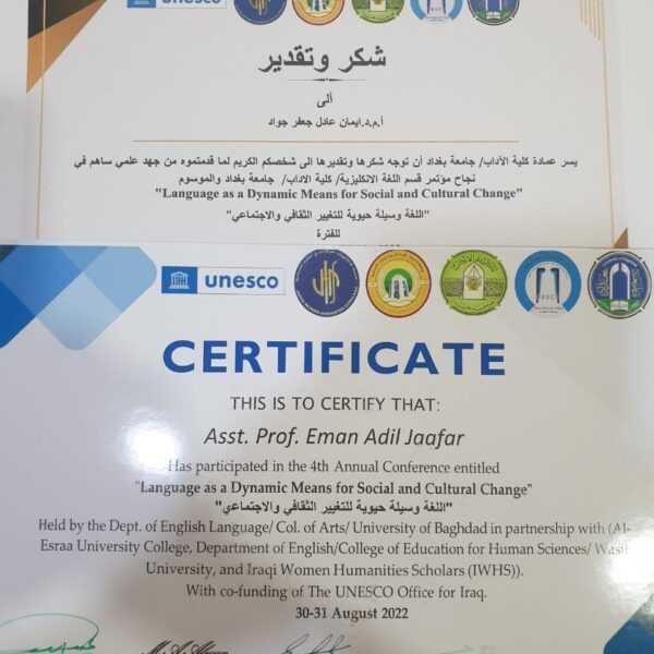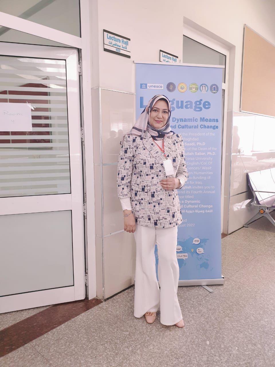 Asst. Prof. Eman Adil Jaafar has attended the fourth conference of the College of Arts / University of Baghdad about (Language as a Dynamic Means for Social and Cultural Change). The Conference was held at AL ESSRA University College, on September 22, 2022. Asst. Prof Jaafar presented a paper titled Investigating Roles and Views in Social Media Communication Addressing Climate Change: A Corpus-Based Study.