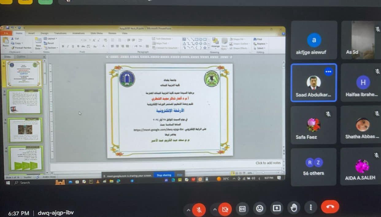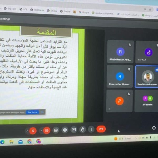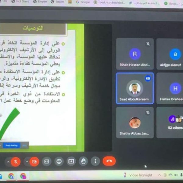 Sponsored by the Dean of the College of Education for Women Dr. Athmar Shaker Majeed AL-Shatri,The lifelong learning unit held the electronic workshop titled “Electronic Archiving” on Saturday, 25/5/2024 at six pm on the Google meet application. The workshop aimed to introducing the concept of electronic archiving , explaining the importance of electronic archiving in administrative work , Stages and steps of implementing electronic archiving according to their sequence and the most important requirements that must be met to complete electronic archiving