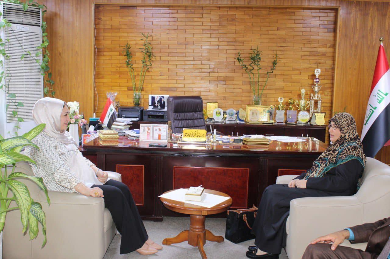 The Dean of the College of Education for Women, Dr. Athmar Shaker Majeed Al-Shatri, received on Tuesday morning, 4/6/2024, the Director General of the Psychological Research Center, Assistant Professor Dr. Hawra Ali Al-Muburqa, and the Assistant Director General for Administrative Affairs, Dr. Ali Fadala. For her part, the Dean of the College of Education for Women, Dr. Athmar Al-Shatri, expressed her thanks and gratitude for this visit, stressing her full readiness to work on a mechanism of joint scientific research cooperation with research centers in all state institutions in order to serve the community and enhance the role of the university in this context.