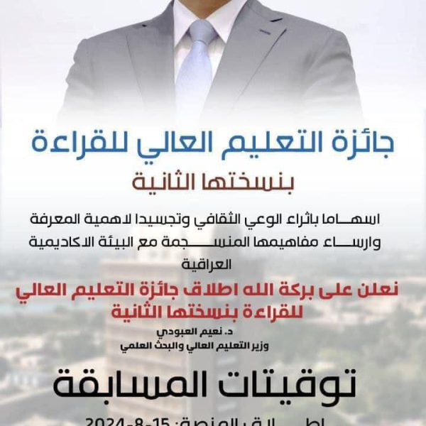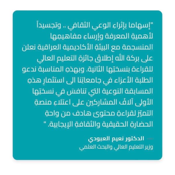 This competition, sponsored by the Ministry of Higher Education and Scientific Research, aims as a positive window to spread cultural awareness and encourage reading and competition among Iraqi university students.
