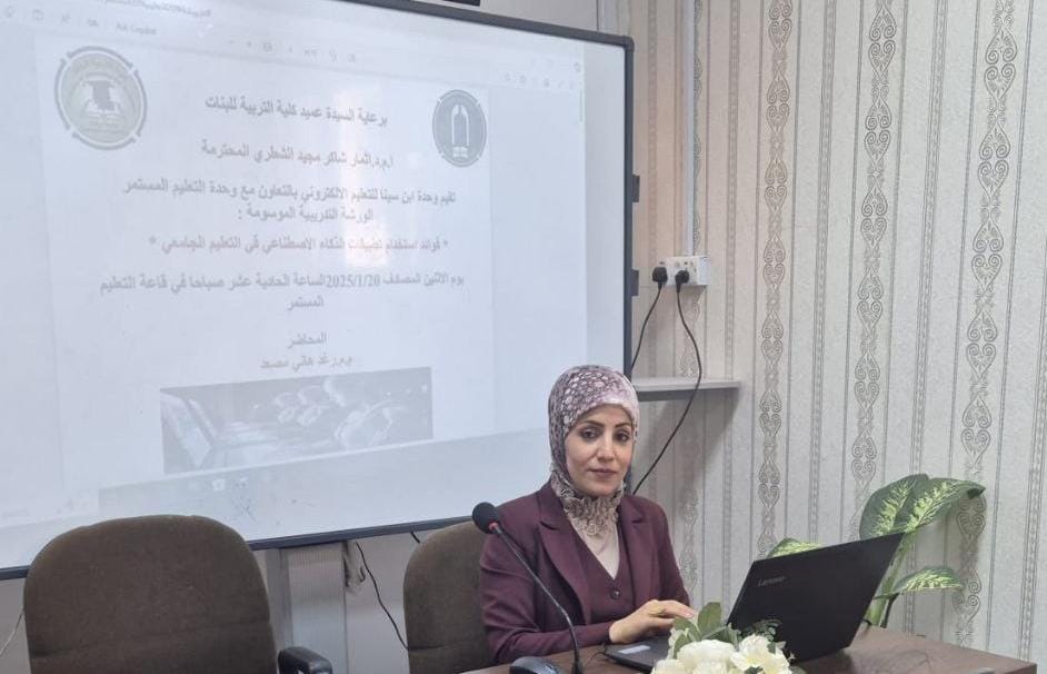 Under the supervision of the Dean of the College of Education for Women, Prof. Dr. athmar Shaker Majeed Al-Shatri, and the supervision of the official of the Ibn Sina E-Learning Unit, the respected Nadia Hussein Munkhi, the unit, in cooperation with the Continuing Education Unit, held a training workshop tagged: ((Benefits of Using Artificial Intelligence Applications in Teaching))at eleven o’clock in the morning, on Monday, 20/1/2025, and at the Continuing Education Hall, attended by a group of faculty professors and students, and lectured: Eng. Raghad Hani Elevator Respected.