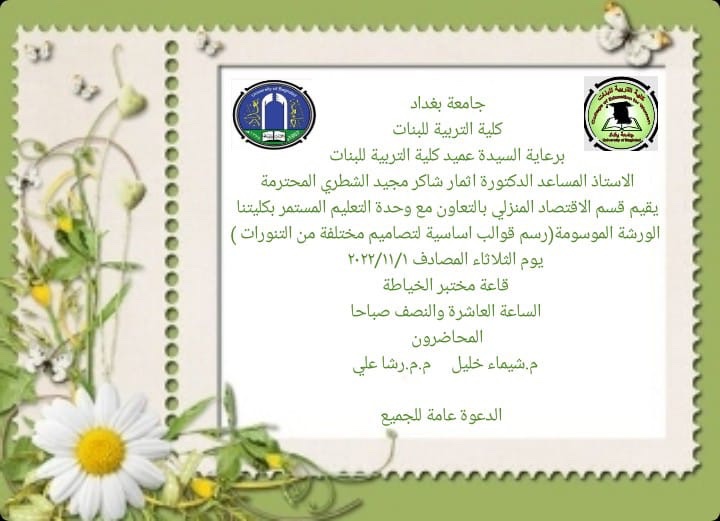 Department of Home Economics and Lifelong Learning Division organized a joint workshop about (Skirt Drawing Templates), at the Sewing Hall, on November 1. Lect. Shaima Khalil and Asst. Lect. Rasha Ali emphasized the importance of taking accurate body measurements and drawing precise body measurement charts.