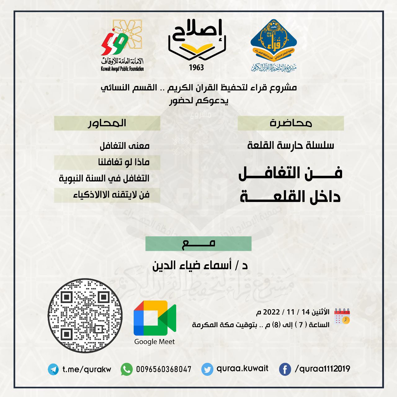 Asst. Prof. Dr. Asmaa Dhia’-Aldeen Ahmed, from Dept. of Quran Sciences and Islamic Education participated in Guardian of the Palace Program. Dr. Ahmed discussed (What to Overlook) to avoid family problems and disagreements, solve family issues, and build strong family relations.