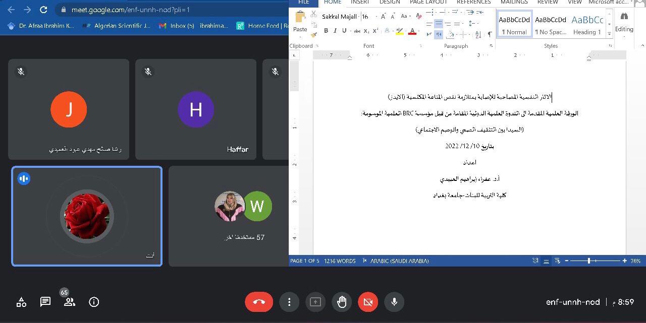 Prof. Dr. Afraa Ibrahim Al-Aubaidi, from the Department of Home Economics, has participated in an international symposium about “HIV: Social Stigma and Health Education”, on Google Meet, December 10. The symposium was organized by the Biological Research Center (BRC) along with international universities and institutions. Dr. Al-Aubaidi presented a paper titled “The Impact of HIV on the Mental Health”.