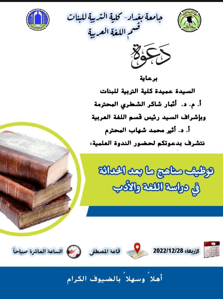 Department of Arabic Language organized a symposium about (Postmodernism in Literature and Linguistics), at the lecture room for graduate education, on Wednesday, December 20, 2022. The main themes of the symposium included modernism and postmodernism on the curriculum, postmodernity in Arabic literature, and engaging with postmodernism in the Arabic World.