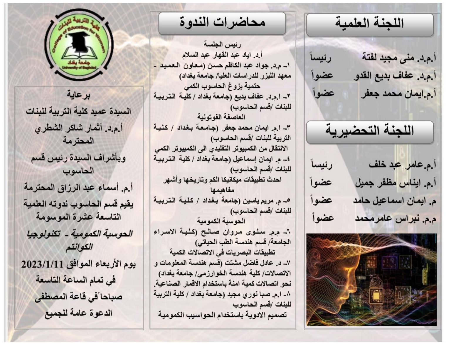 Department of Computer Sciences organized a symposium about (Quantum Computing – Quantum Technology), at Al-Mustafa Hall, on Wednesday, Jan. 11, 2023. The symposium aimed to shed light on the concept of quantum mechanics and its uses in other disciplines, including engineering, biology, chemistry, and computer sciences. The presented papers mainly addressed the impact of quantum computing on scientific development. The researchers also explained how quantum computing will affect the world.