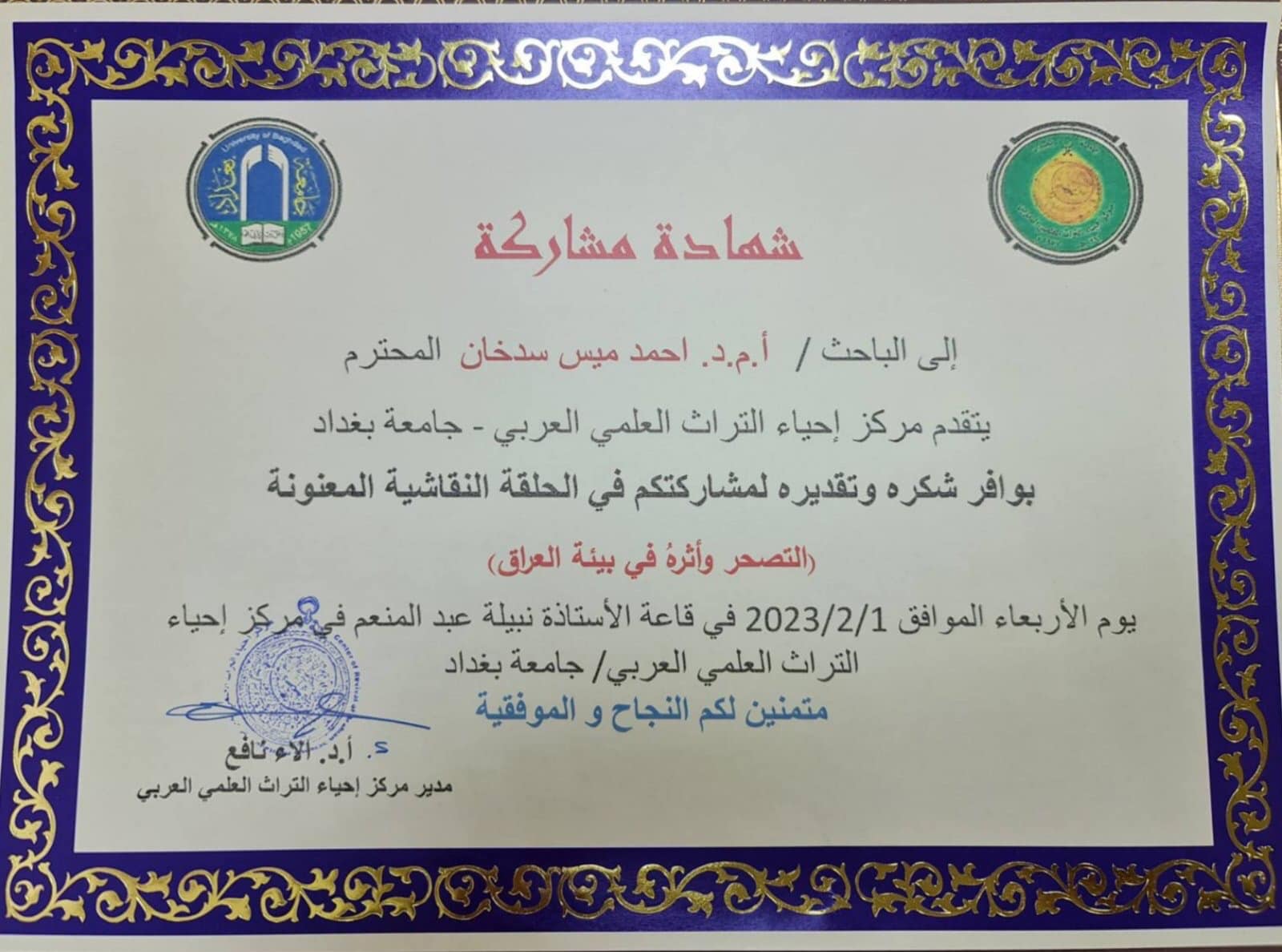 Asst. Prof. Dr. Ahmed Mays Sadkhan participated in a seminar about (Desertification and the Plunge of Water Resources in Iraq), at Heritage Revival Centre / University of Baghdad, on Wednesday, Feb. 1, 2023. The workshop addressed the impact of climate change on Iraq, the causes of desertification, and the water crisis.