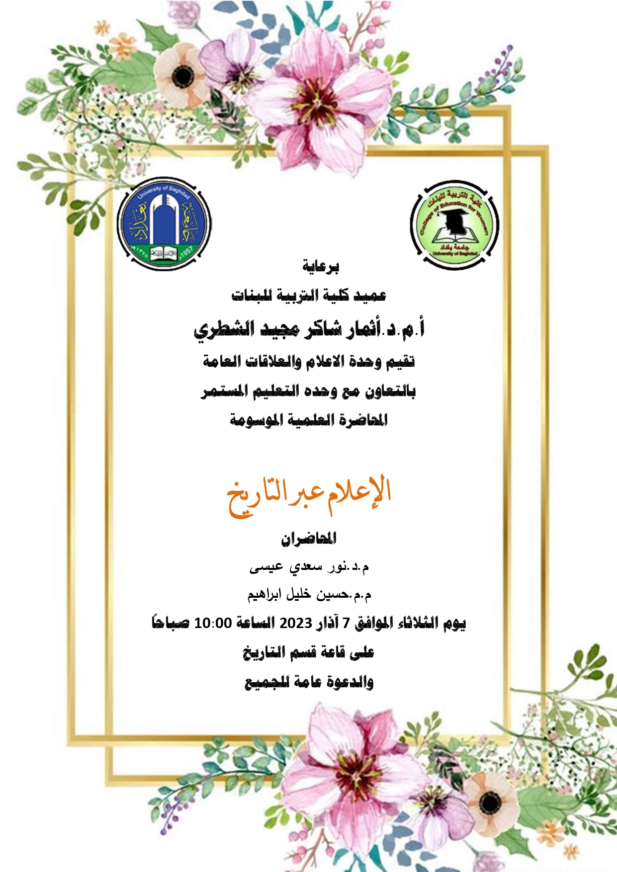 Media and Communications Office and Lifelong Learning Unit organized a joint lecture about (The History of Media), at the Dept. of History, on March 7, 2023. Both Lect. Dr. Noor Saadi and Asst. Lect. Hussein Khalil Ibraheem discussed the evolution of media, traced its origins, and explained its influence on politics and society.