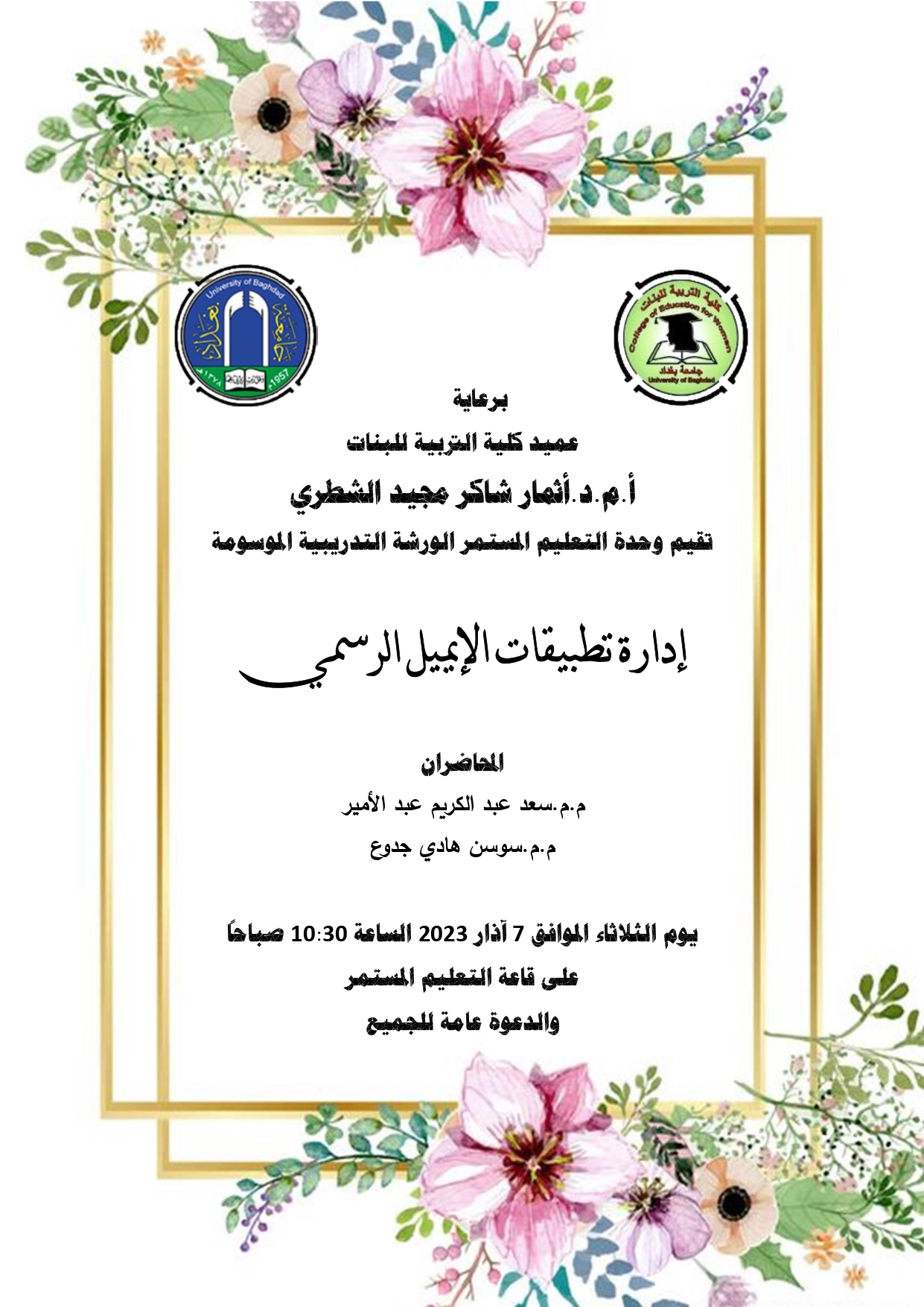 Lifelong Learning Unit organized a workshop about (Email Management Software), at Lifelong Learning Hall, March 7, 2023. Asst. Lect. Saad Abdulkareem Abdulameer and Asst. Lect. Sawsan Hadi explained the types and functions of professional email software. The workshop included a training session on how to set up a professional email address.